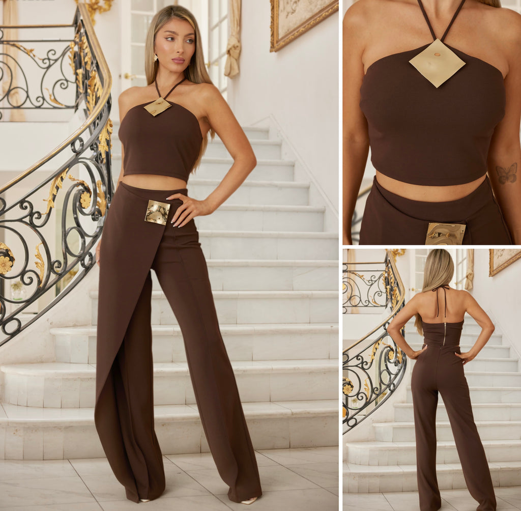 This brown two-piece set is perfect for everyday wear. It features a comfortable top and high-waist pants with simple gold details on both pieces for a subtle, stylish touch. Made from soft, stretchy fabric, it feels great on the body and gives a flattering fit without sacrificing comfort. Easy to dress up or down, this set is ideal for casual outings, brunch, or relaxed days out.