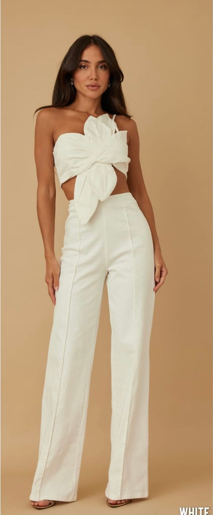 Fresh, feminine, and effortlessly chic, this white two-piece set features a statement strapless top with a beautiful leaf-inspired design and matching high-waist pants.